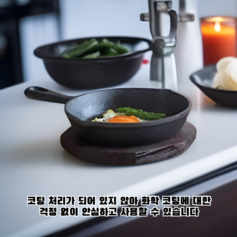 ● 무코팅 제품이라 화학 코팅 걱정 없이 건강하게 요리할 수 있으며, 주물팬 특유의 깊은 풍미와 바삭한 식감을 느낄 수 있습니다.